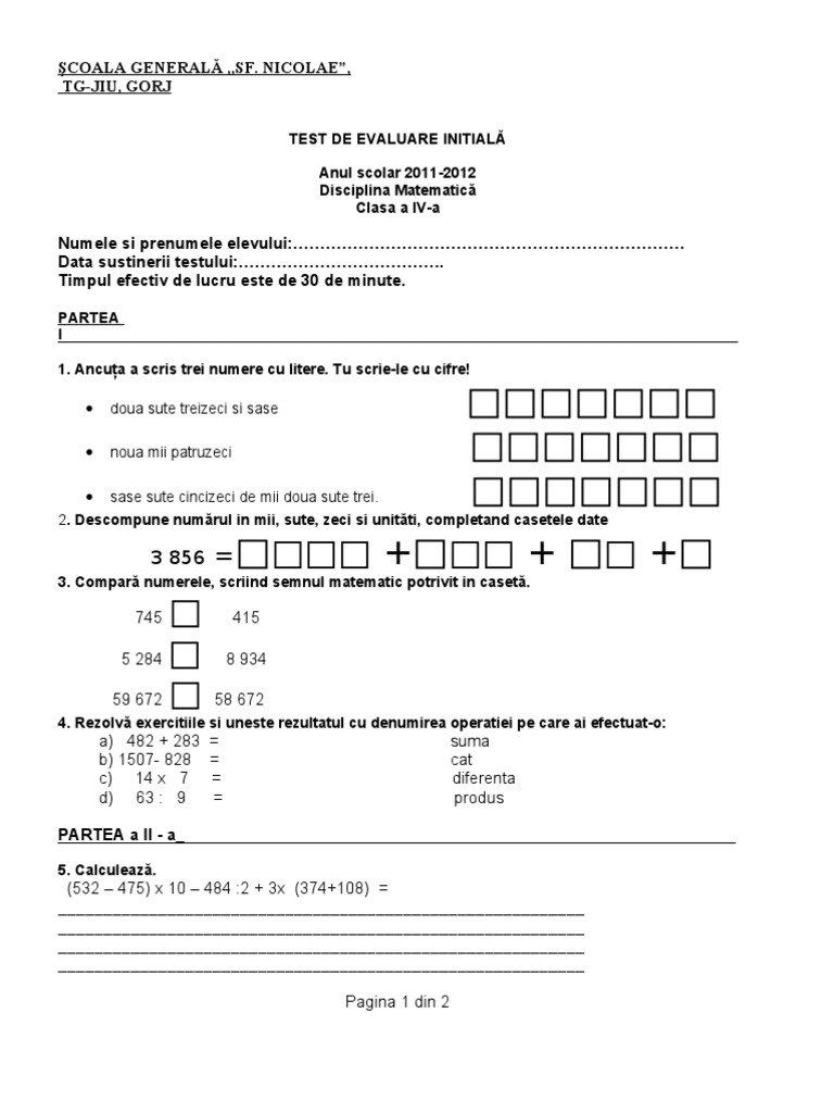 Fise De Lucru Scolari I Iv Fisa De Evaluare Initiala La Matematica Pentru Copiii De Clasa A Iv A