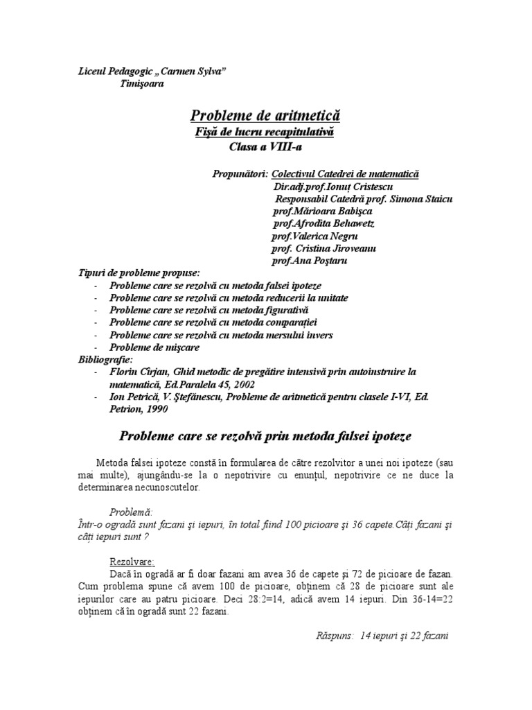 Probleme De Aritmetica Fisa De Lucru Cls Viii Doc
