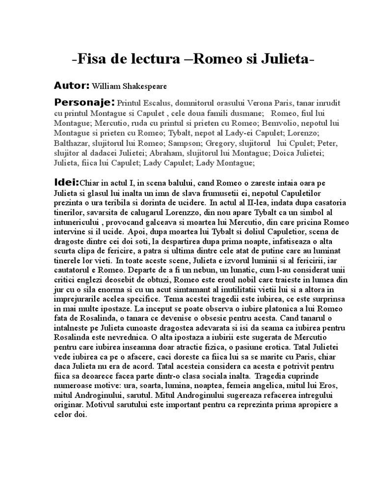 Fisa De Lectura Romeo Si Julieta