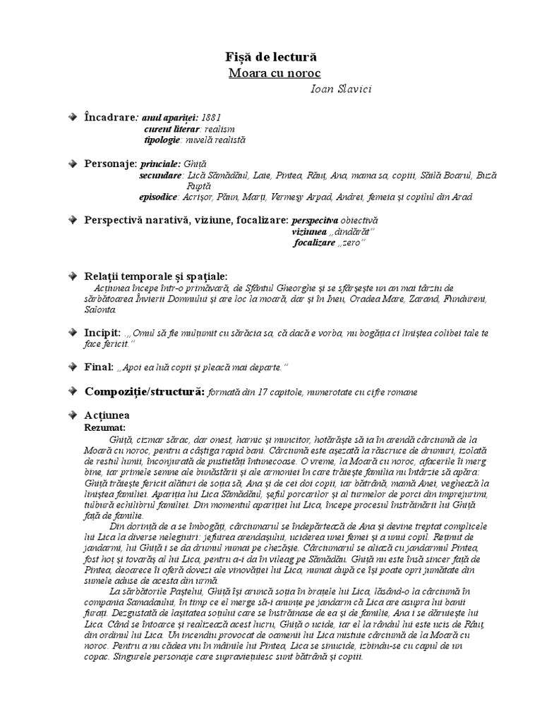 Fisa De Lectura Moara Cu Noroc