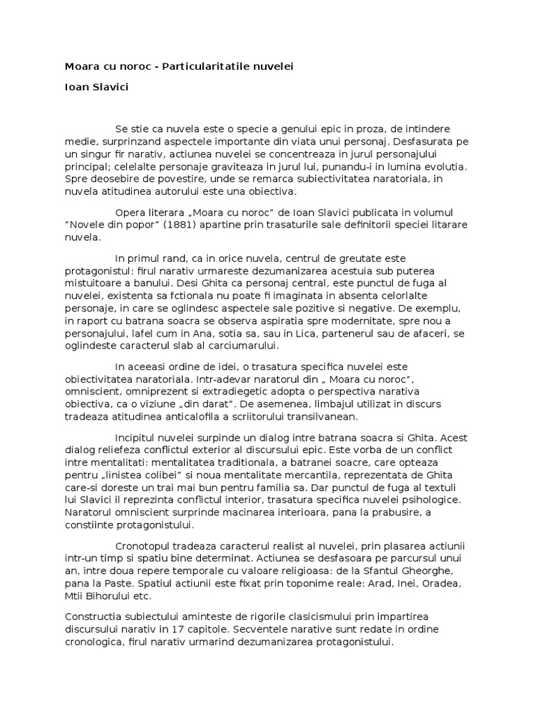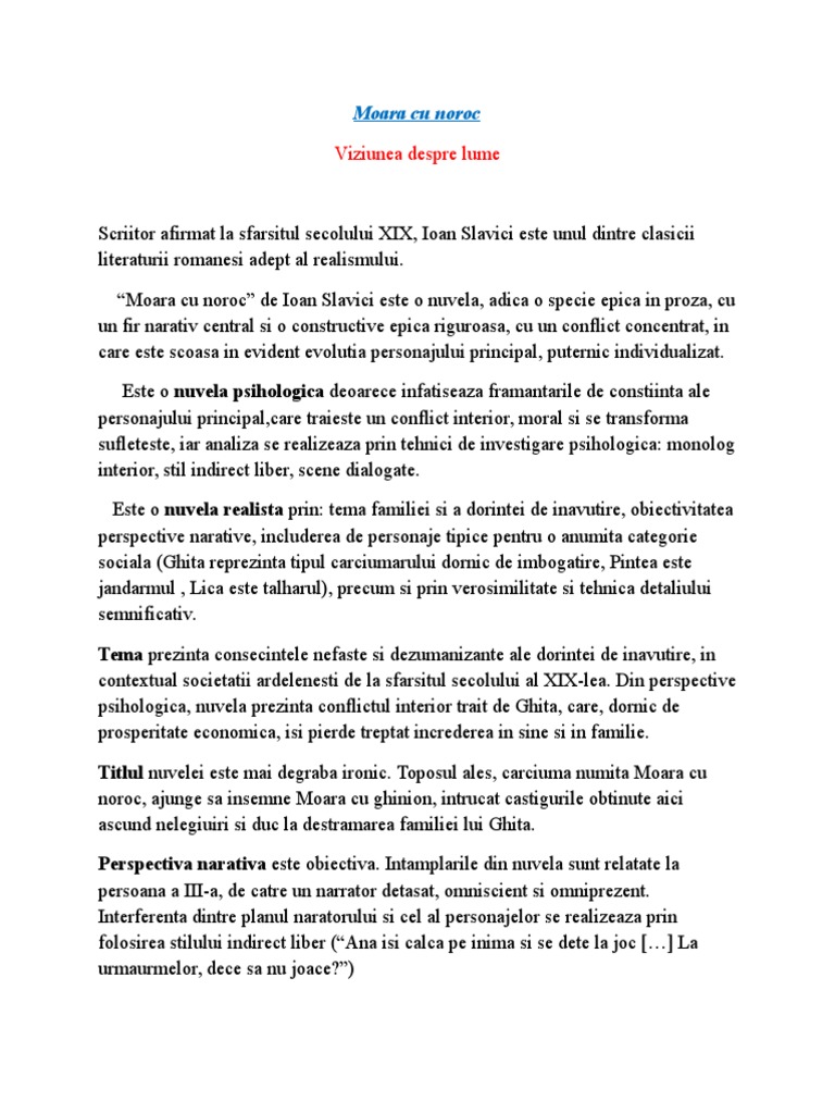 Moara Cu Noroc Ioan Slavici Comentariu Literar Alina S