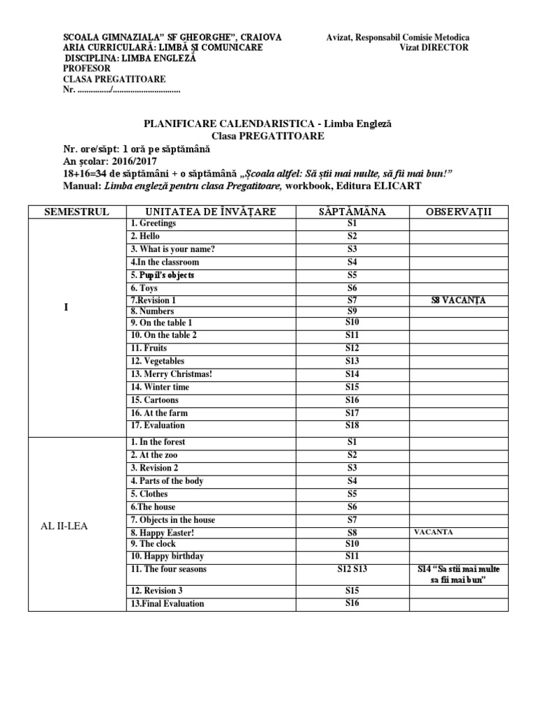 Free Clasa Pregătitoare Model De Planificare Anuală Detaliată