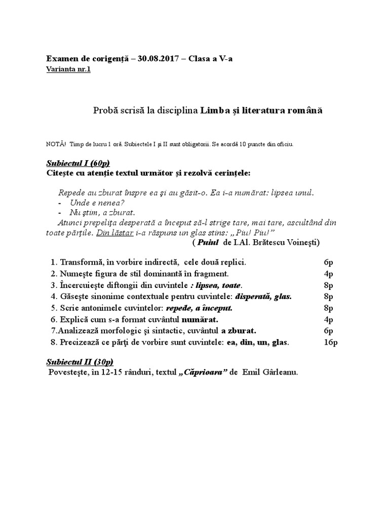 Probă Scrisă La Disciplina Limba Si Literatura Romană Examen De Corigenţă 30 08 2017 Clasa A V A