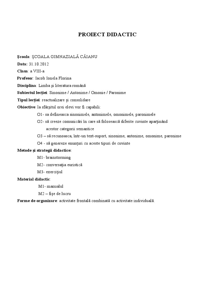Proiect Didactic Sinonime Antonime Omonime Paronime
