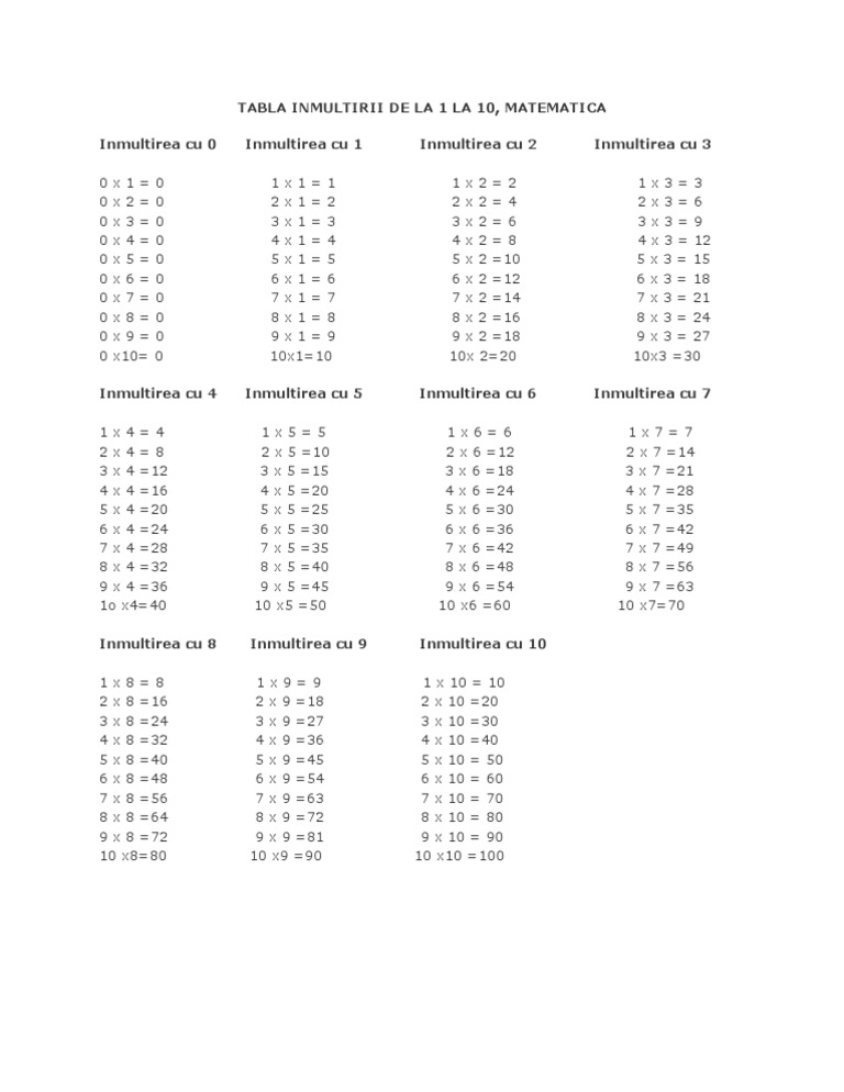 Tabla Inmultirii De La 1 La 10