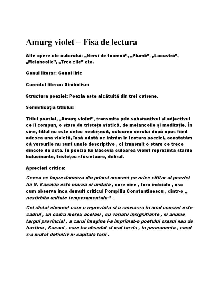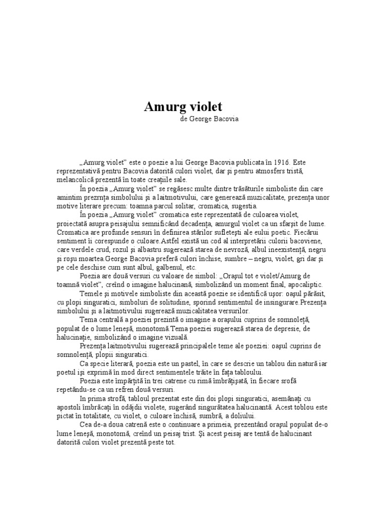 Amurg Violet De George Bacovia Comentariu Literar Si Versuri Pentru Bacalaureat