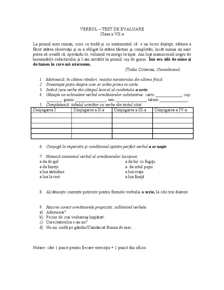 Test De Evaluare Verbul Clasa A Va